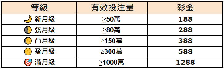 • 舉例:若達成300萬流水(盈月級),可一次領取: